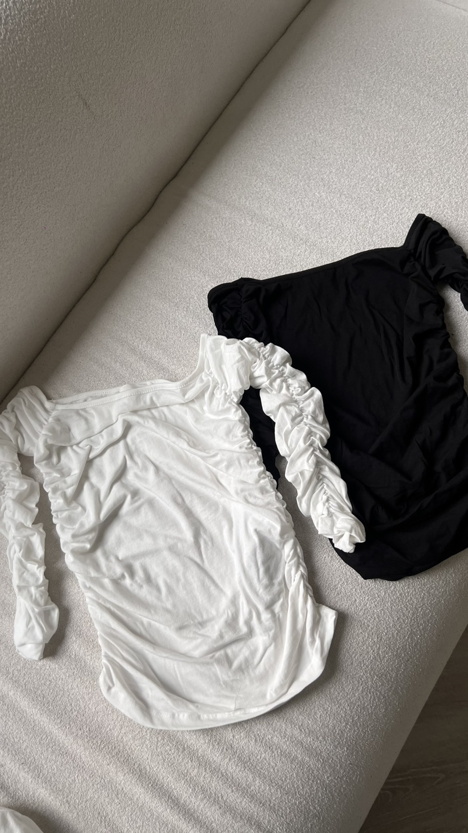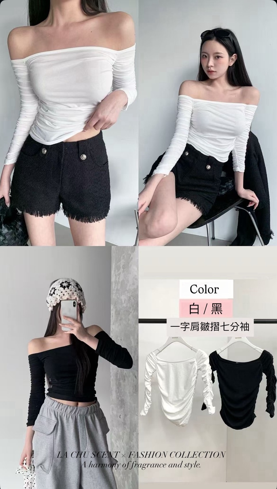 一字肩皺褶七分袖